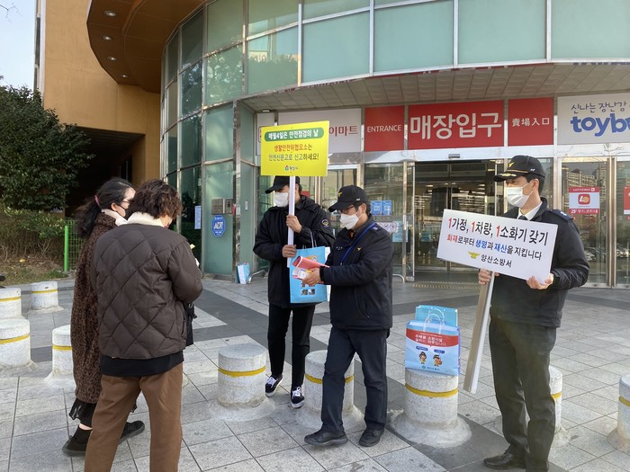 이번 집중 홍보는 12월 24일 14시부터 관내 대형마트 일원에서 ▲'화재위험 3대(전기히터, 전기열선, 화목보일러) 겨울용품' 안전사용 홍보 ▲1차량 1소화기 갖기 운동, 음식점·다중이용업소 등 주방 내 K급 주방용 소화기 비치 홍보 ▲안전무시 관행 근절을 위한 신고포상제 운영 등 시민들에게 피켓 홍보 및 홍보물을 배부했다.