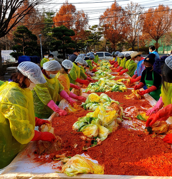 경기 안산시 상록구 부곡동 행정복지센터는 최근 어려운 이웃을 위한 ‘살맛나는 김장나눔’ 행사를 열고 직접 만든 김장김치 9kg·300상자를 지역내 저소득층 및 복지사각지대 주민들에게 전달했다. 사진은 이날 참가한 봉사자들이 김장을 하고 있는 모습. (사진제공=안산시청)