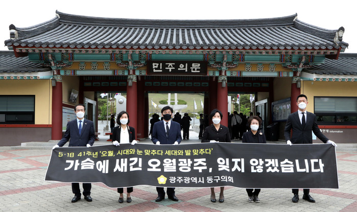 10일 오전 광주 북구 운정동 국립 5.18민주묘지에서 광주 동구의회 의원들이 5.18 민주화운동 41주년을 기념하는 펼침막을 들고 있다. 동구의회 의원들과 사무국 직원들은 5.18 41주년을 기리고자 이날 민주묘지를 참배했다.