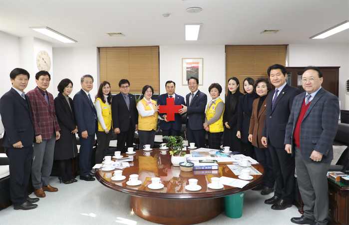 최근 서울 강동구의회가 의장실에서 ‘2020년 강동구의회 적십자 특별회비’를 전달했다. 이번에 전달한 특별회비는 취약계층 의료지원, 재난구호 활동, 재난안전 교육 등을 위해 사용될 예정이다. 사진은 특별회비 전달 후 기념촬영을 하고 있는 의원들과 관계자들의 모습. (사진제공=강동구의회)