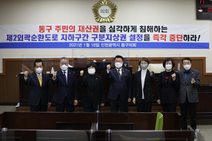 이에 구의회는 동구 주민의 재산권에 막대한 손실을 입힌 관계부처와 인천김포고속도로(주)를 대상으로 ▲동구 주민의 재산권을 심각하게 침해하는 제2외곽순환도로 지하구간 구분지상권 설정 즉각 중단 ▲대심도 지하구간에 대한 합리적인 관리 방안을 마련하여 조속히 시행할 것을 강력히 주장했다.