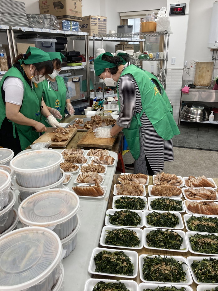 경기 동두천시 중앙동 새마을부녀회와 지역사회보장협의체는 최근 중앙동 홀몸노인 30여가구에 사랑의 밑반찬 나눔을 실시해 얼갈이김치, 돼지고기 수육 등을 준비해 홀몸노인 30여가구에 비대면으로 전달했다. 사진은 이날 봉사자들이 음식을 준비하고 있는 모습. (사진제공=동두천시청)