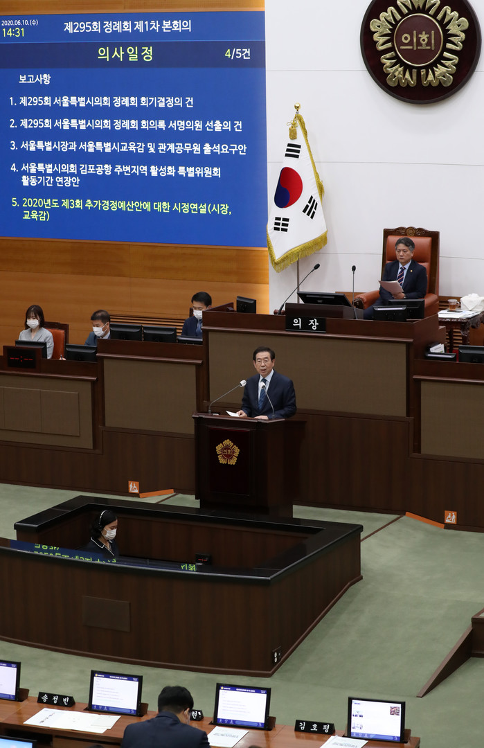 10일 오후 서울시의회에서 열린 제295회 정례회 제1차 본회의에서 박원순 서울시장이 3차 추가경정예산안에 대한 시정연설을 하고 있다.