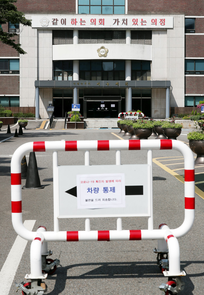 인천지역에 신종 코로나바이러스 감염증(코로나19) 확진자가 속출한 24일 오전 인천 서구 서구의회 청사가 폐쇄돼 있다. 인천 서구청은 본청 소속 공무원 3명과 서구의회 공무원 1명 등 4명이 잇따라 확진 판정을 받으면서 청사를 모두 폐쇄했다.