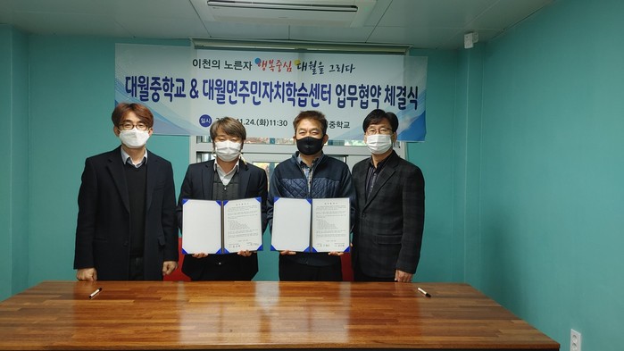경기 이천시 대월면주민자치위원회는 최근 대월중학교와 상호협력체계를 구축하고 발전 지향적인 협력사업 및 교류를 위해 업무협약(MOU)을 체결했다. 사진은 협약식에서 관계자들이 기념촬영을 하고 있는 모습. (사진제공=이천시청)