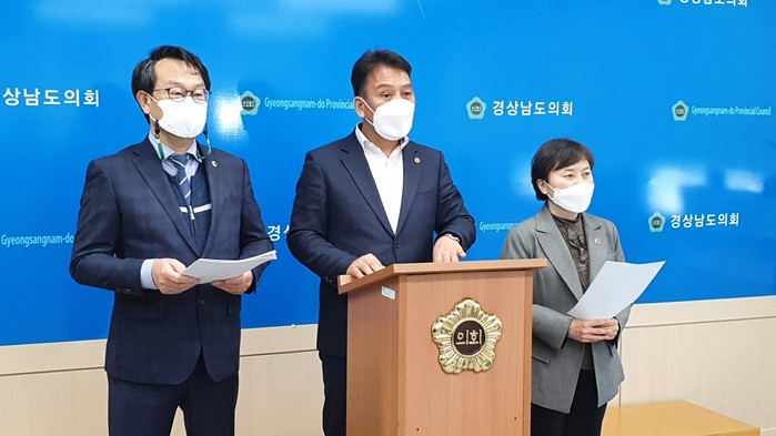 경남도의회 더불어민주당 원내대표단이 5일 도의회 브리핑룸에서 도의원의 배우자와 직계존비속까지 소유 부동산 보유현황을 조사하자고 제안하는 회견을 열고 있다.