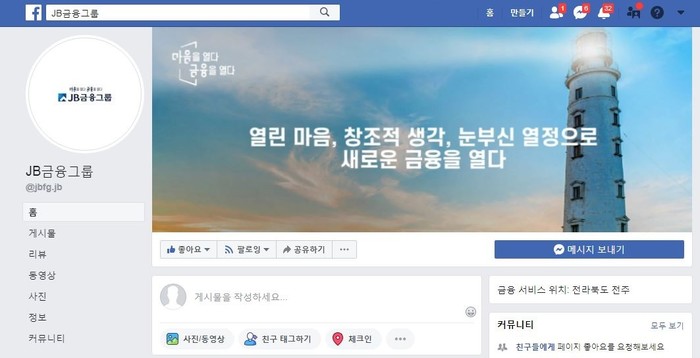 | ▲ JB금융그룹 공식 페이스북 계정 메인화면. (사진제공=JB금융그룹) |