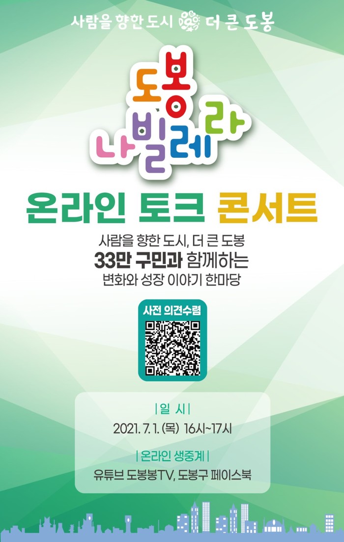 [시민일보 = 여영준 기자] 서울 도봉구(구청장 이동진)는 민선7기 3주년을 기념해 오는 7월1일 오후 4시 '도봉 나빌레라' 토크콘서트를 온라인으로 개최한다고 28일 밝혔다.