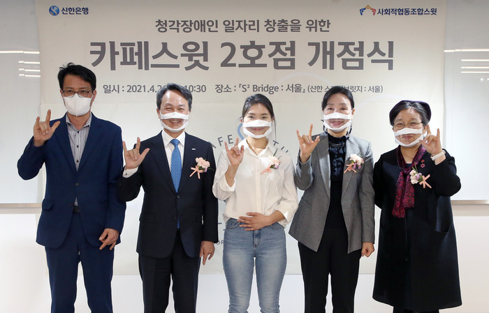 [시민일보 = 이대우 기자] 신한은행(은행장 진옥동)은 최근 서울 성동구 왕십리로에 소재한 'S² Bridge : 서울' (신한 스퀘어브릿지)에서 청각장애인 일자리창출 지원 사업인 ‘카페스윗(Cafe S ㅇwith)’ 2호점 개점식을 열고 본격 운영에 들어갔다.