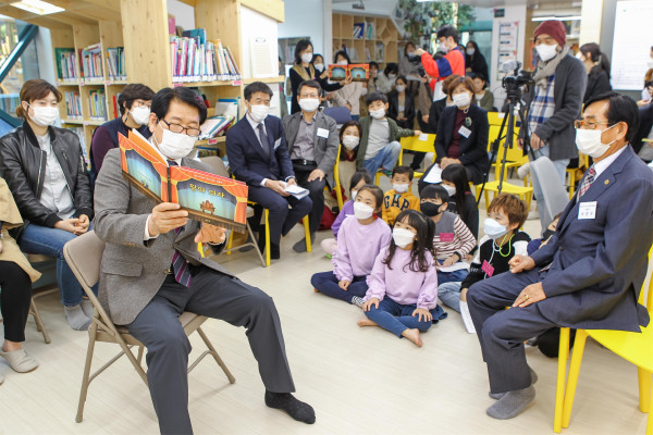 | ▲ 양평호 의원이 아이들에게 책을 읽어주며 즐거운 시간을 보내고 있다. (사진제공=강동구의회) |