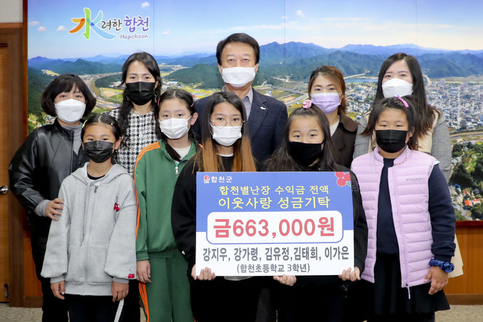 경남 합천군(군수 문준희)은 지난 6일 합천초등학교 3학년 강지우, 강가령, 김유정, 김태희, 이가은 학생은 합천별난장터 수익금 전액을 합천초등학교 어린이(소년소녀 가장 또는 한부모)에 써달라며 이웃돕기 성금 663,000원을 기탁했다고 밝혔다.