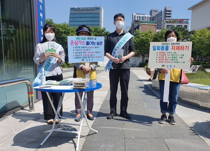 서울 성동구는 최근 제26회 세계 환경의 날을 맞이해 불필요한 인쇄·메모 등 종이 사용 줄이기 등을 실천하는 ‘종이 안쓰는 날(No Paper Day)’을 지정하고, 탄소중립 생활실천을 위한 캠페인을 실시했다. 사진은 왕십리 광장에서 구 직원들이 성동구주부환경연합회와 함께 ‘종이 안쓰는 날’ 캠페인을 진행하고 있는 모습. (사진제공=성동구청)