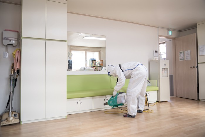 | ▲ 신종코로나 예방을 위해 어르신사랑방 방역을 실시하고 있는 구청 직원. (사진제공=강동구청) |
