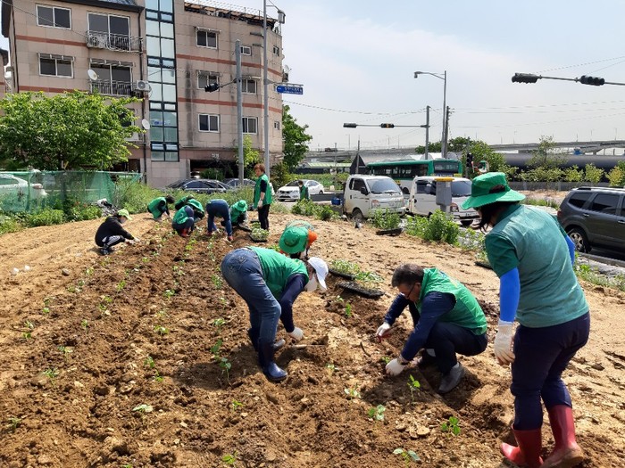 인천 계양구 새마을회는 기후 위기와 전면적인 생명의 위기를 극복하기 위해 최근 부녀회, 직장협의회 회원 등이 총 17명이 참여한 가운데 장기동 93-4 일원에 케나프(양삼)를 식재했다. 사진은 회원들이 케나프 모종을 심고 있는 모습. (사진제공=계양구청)