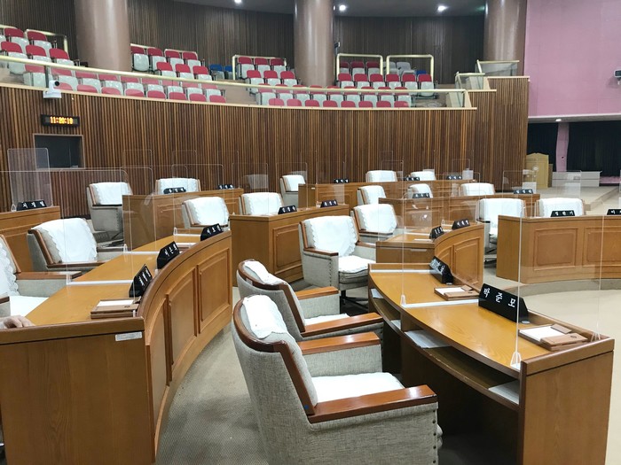 | ▲ 가림막이 설치된 본회의장 모습. (사진제공=안양시의회) |