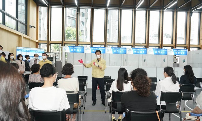 서울 성북구가 5일부터 코로나19 예방접종 제2센터 문을 열었다. 제2센터 설치장소는 종암사거리 내부순화로 교각하부공간에 위치한 ‘종암 박스파크’로 월~토요일 주 6일, 오전 8시30분~오후 4시30분 접종을 진행한다. 사진은 지난 2일 이승로 구청장(가운데)이 센터 전반에 대해 최종 점검을 하고 직원들에게 당부를 하는 모습. (사진제공=성북구청)