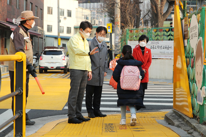 | ▲ 지역내 경수초등학교 통학로 안전을 점검하는 정원오 구청장(왼쪽 두 번째)의 모습. (사진제공=성동구청) |