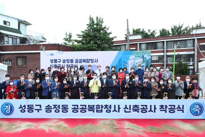 서울 성동구는 최근 ‘성동구 송정동 공공복합청사 착공식’을 개최했다. 새롭게 건립될 공공복합청사는 지하 3층~지상 5층, 연면적 6062㎡ 규모로, 노인복지센터·보건지소 등 다양한 행정복지시설이 들어설 예정이다. 사진은 착공식에서 정원오 구청장(앞줄 가운데)이 관계자들과 시삽식을 진행하고 있는 모습. (사진제공=성동구청)