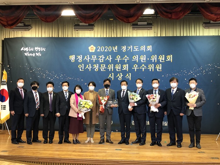 경기도의회 문화체육관광위원회가 최근 도의회에서 주관하는 2020년 행정사무감사를 빛낸 우수위원회로 선정돼 표창을 받았다. 이번 수상으로 2018년부터 3년 연속으로 수상하는 영예를 안았다. 사진은 장현국 의장(오른쪽 다섯 번째)이 표창 수여 후 문화체육관광위원들과 기념촬영을 하는 모습. (사진제공=경기도의회)