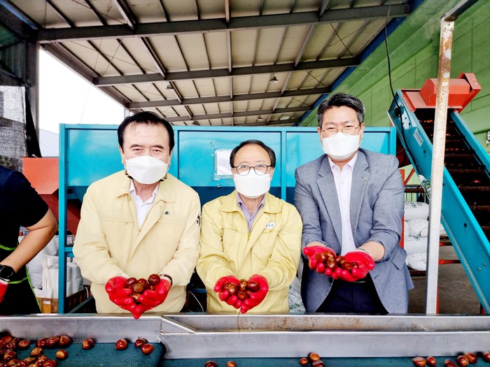 서춘수 함양군수는 지난 23일 함양농협 농산물산지유통센터에서 노기창 농협중앙회 함양군지부장과 강선욱 함양농협장과 함께 밤 수매 현장을 둘러보며 현장 애로사항을 청취하고 관계자를 격려하였다.