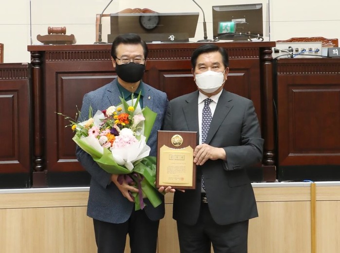 성장현 서울 용산구청장이 9일 용산구의회 본회의장에서 구의회와의 상호존중과 상생협력으로 의정 발전에 기여한 공을 인정받아 조영훈 서울시구의회의장협의회장으로부터 감사패를 받았다. 사진은 이날 성 구창장(왼쪽)이 조 회장으로부터 감사패를 받은 후 기념촬영을 하는 모습. (사진제공=용산구청)