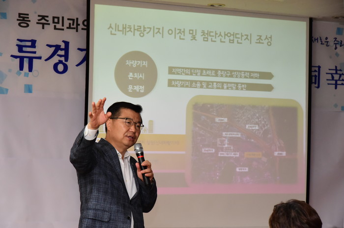 | ▲ 신내1동 주민과의 동정책간담회에서 류경기 구청장이 신내차량기지 이전 및 첨단산업단지 조성 사업에 대해 설명하고 있다. |