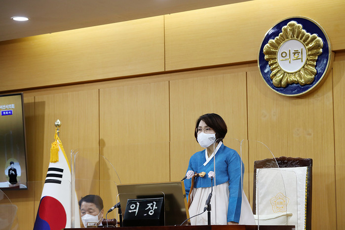 | ▲ 서산시의회는 제1차 본회의를 열고 제258회 임시회를 개회했다. 사진은 이연희 의장이 개회사를 낭독하고 있는 모습. (사진제공=서산시의회) |