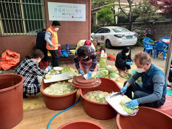 인천 서구 검단동 희망우산 지역사회보장협의체는 최근 봄김치 나눔행사를 열고 봄철 맛김치를 직접 담가 저소득 거동불편 홀몸노인·장애인 등 30가구에 방문해 전달했다. 사진은 이날 봉사자들이 김치를 만들고 있는 모습. (사진제공=서구청)