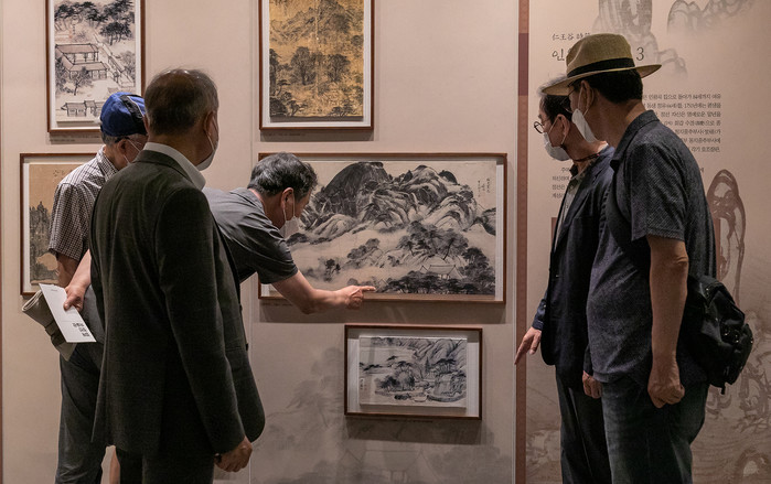서울 강서구가 겸재 정선의 진경산수화 가운데 대표작인 ‘인왕제색도’를 지역내 겸재정선미술관에 유치하기 위해 청와대 국민청원에 나섰다. 사진은 14일 겸재정선미술관을 찾은 시민들이 인왕제색도 영인본을 관람하고 있는 모습. (사진제공=강서구청)