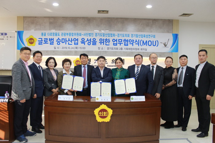 [수원=채종수 기자] 경기도의회 의원연구단체인 '경기말산업육성연구회'는 최근 사단법인 경기도말산업협회와 함께 몽골 다르항올도 관광총연합회와 ‘글로벌 승마산업 육성을 위한 업무협약식(MOU)’을 개최하고 상호 협조체제 구축 등 승마산업 육성을 위해 손을 맞잡았다.