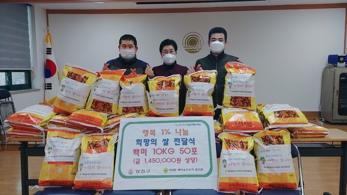 서울 양천구 목3동 복지건강팀에 능이랑 추어탕으로부터 어려운 이웃을 위한 사랑의 쌀 30포(10kg, 87만원 상당)가 도착했으며, 목4동에도 목4동 새마을지도자협의회으로부터 이웃에게 행복과 희망을 선물하고자 쌀 50포(10kg, 145만원 상당)를 후원했다. 사진은 목4동의 희망의 쌀 전달식에서 관계자들이 기념촬영을 하는 모습. (사진제공=양천구청)