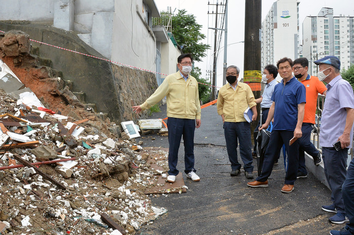유덕열 서울 동대문구청장이 지난 11일 집중호우로 인한 피해상황을 확인하기 위해 현장 점검에 나섰다. 사진은 유 구청장(왼쪽)이 붕괴된 전농동 공가 주택을 방문해 수습 상황을 확인하고 있는 모습. (사진제공=동대문구청)