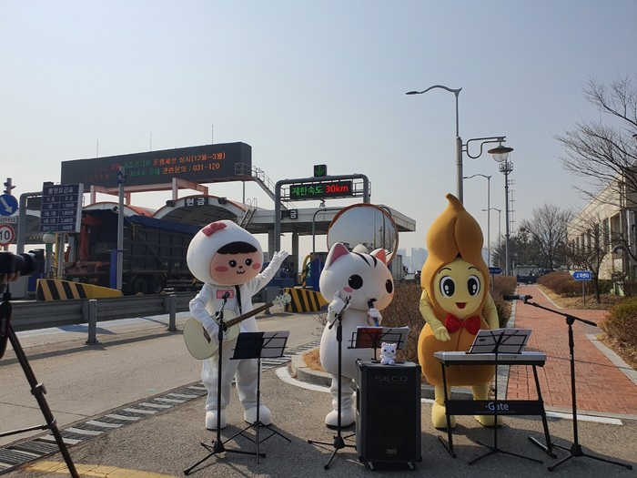 | ▲ 사진제공=고양시청/일산대교 통행료 홍보영상 ‘일산대교’ 촬영 모습. 왼쪽부터 김포시 캐릭터 ‘포미’, 고양시 캐릭터 ‘고양고양이’, 파주시 캐릭터 ‘장단콩’ |