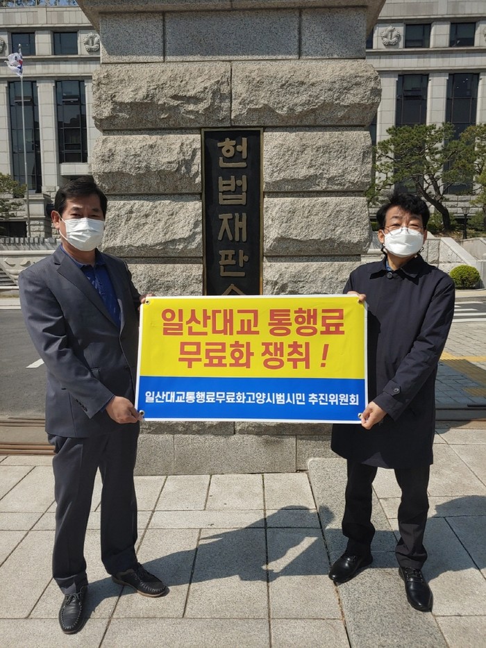 일산대교 통행료무료화 고양시범시민추진위원회는 “한강교량 중 유일하게 통행료를 부과하는 일산대교로 이용 시민들의 행동자유권, 평등권, 재산권을 침해당해 헌법에 위반된다”며 일산대교 통행료 부과처분에 대해 헌법소원심판을 청구하고 무료화 홍보 및 서명운동, 1인 시위, 캠페인성 집회시위를 펼쳤다.