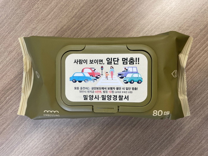 밀양시는 관내 어르신들의 교통사고 예방과 교통안전 홍보를 위해 밀양경찰서와 합동으로 홍보용 물티슈와 반사스티커를 제작해 직접 배부하고 부착한다고 26일 밝혔다.