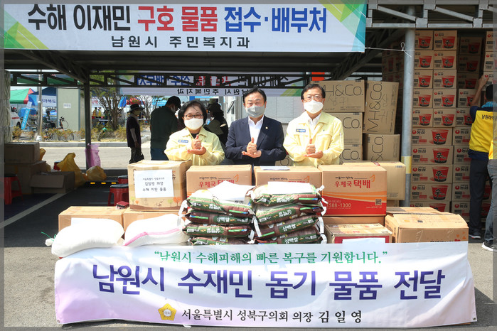 [시민일보 = 홍덕표 기자] 김일영 서울 성북구의회 의장이 최근 집중 호우로 피해를 입은 전북 남원시 금지면 수해 지역을 방문해 쌀, 의류, 마스크 물티슈 등의 수해 이재민 구호 물품을 전달했다.