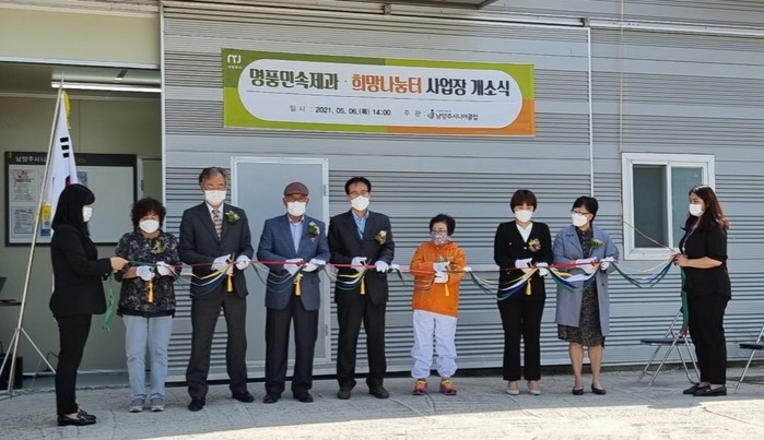 경기 남양주시니어클럽은 최근 만 60세 이상 노인 일자리를 창출하고 더좋은 환경 제공을 위해 명품민속제과·희망나눔터 사업단의 식품제조 및 공동작업장을 이전 개소했다. 사진은 개소식에서 관계자들이 테이프 커팅을 하고 있는 모습. (사진제공=남양주시청)
