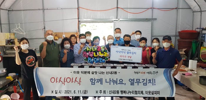 서울 중랑구 신내2동 행복나누리협의체는 최근 홀몸노인들과 함께 홀몸노인들이 직접 기른 열무로 열무김치를 담가 지역내 어려운 이웃 30가구에 전달했다. 사진은 이날 함께한 봉사자들이 기념촬영을 하는 모습. (사진제공=중랑구청)