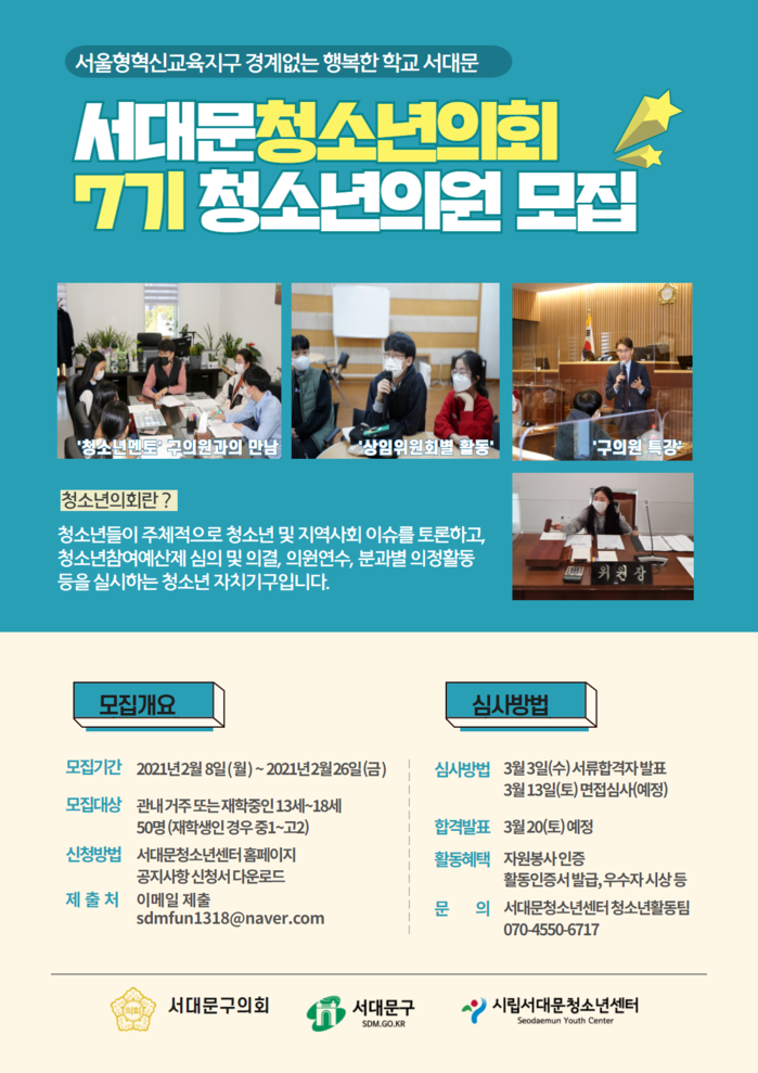[시민일보 = 홍덕표 기자] 서울 서대문구의회(의장 박경희)가 오는 26일까지 '서대문청소년의회' 제7기 청소년 의원을 모집한다.