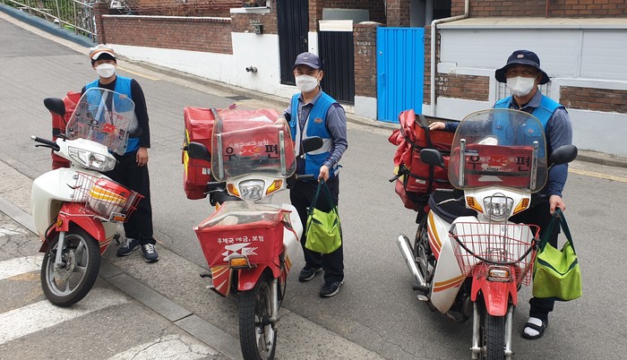 서울도봉우체국 스마일봉사단은 쌍문3동 나눔이웃으로 활동하며 매주 금요일 민간위기거점기관 위기가정 반찬배달사업에 참여해 대상자들에게 반찬을 전달하고 청장년 1인 가구의 안부확인도 하고 있다. 사진은 쌍문3동 스마일봉사단이 반찬을 배달하기 전 기념촬영을 하는 모습. (사진제공=도봉구청)