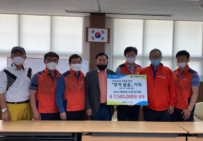 경기 오산시 세마동 주민자치회는 11일 코로나19로 인해 경제적 어려움을 겪고 있는 오색시장상인회와 소상공인연합회에 코로나19 방역물품(마스크, 손 소독제) 2000개를 전달했다. 사진은 주민자치회 위원들이 기념촬영을 하는 모습. (사진제공=오산시청)