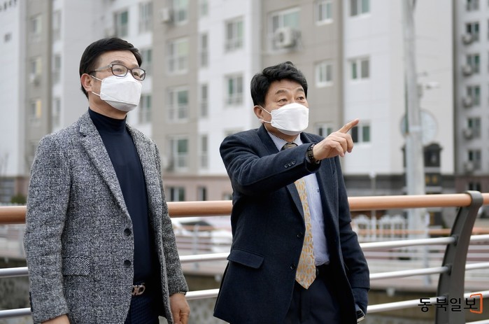 | ▲ 홍국표 의원(오른쪽)이 김위헌 전 위원장과 백운교 현장을 살펴보고 있다. (사진제공=도봉구의회) |