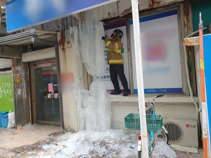 11일 오후 대구 중구 포정동 한 상가에서 소방대원들이 강추위에 만들어진 대형 고드름을 제거하고 있다.