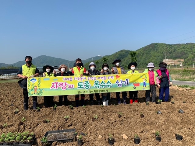 경기 양평군 양서면지역사회보장협의체는 최근 양서면 국수3리 300평 일대에 '어려운 이웃돕기 후원금 마련을 위한 사랑의 토종옥수수 심기' 행사를 진행해 쥐이빨 옥수수를 모종 심기를 완료했다. 사진은 이날 참여한 위원들이 기념촬영을 하는 모습. (사진제공=양평군청)