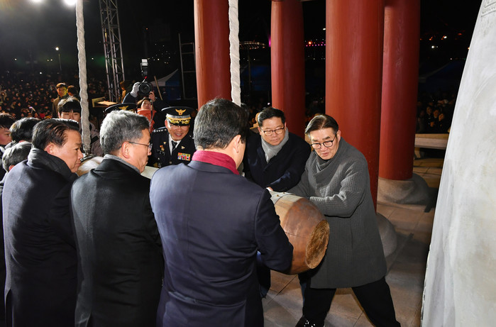 제야의 종 타종은 지역의 국회의원, 시의원, 기관단체장, 시민 및 학생 등 각계각층의 대표가 모여 양산시민이 더불어 잘살고 행복을 누릴 수 있는 염원을 담아 33번 종을 울렸다.