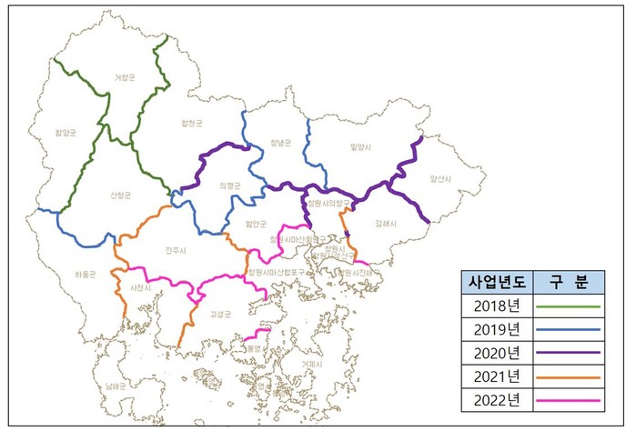 이 사업은 2018년부터 2022년까지 5년간 시행되는 연차사업으로, 총 사업비 6억 6,800만 원을 투입해 거제‧남해를 제외한 16개 시군 28개 구간의 행정구역 경계를 정비하는 사업이다.