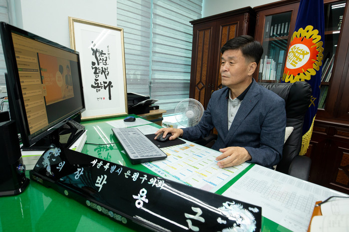 | ▲ 박용근 의장이 원격프로그램을 이용한 ‘4대폭력 예방교육'을 받고 있다. (사진제공=은평구의회) |