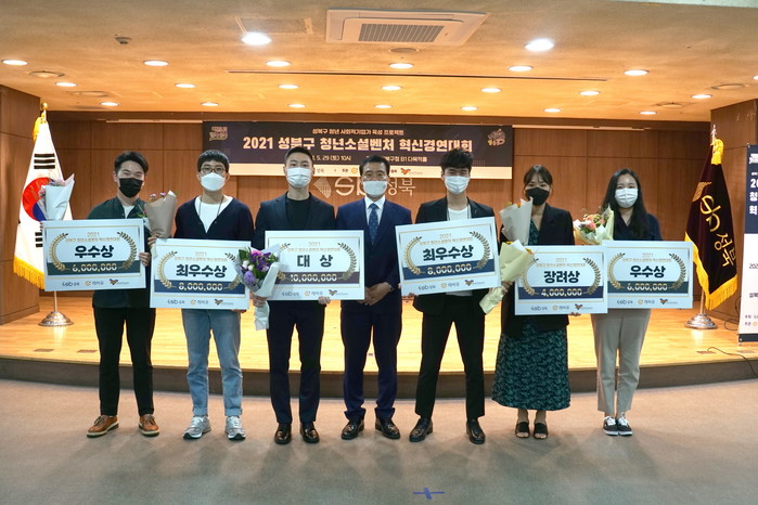 서울 성북구는 최근 '성북구 청년 소셜벤처 혁신경연대회'를 개최했다. 이번 경연대회에 참가한 9팀은 지난 5월1~15일 사회적경제의 이해 등을 주제로 교육 및 사업계획에 대한 전문 컨설팅을 받았고, 경연대회 결과 최종 6팀이 수상의 영광을 안았다. 사진은 시상식에서 이승로 구청장(가운데)과 수상자들이 기념촬영을 하는 모습. (사진제공=성북구청)