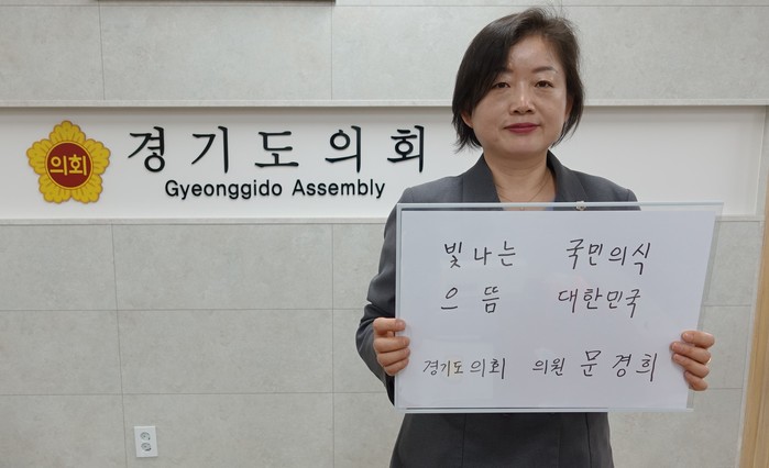 문 도의원은 '빛나는 국민의식 으뜸 대한민국'이라는 응원 문구를 작성해 희망의 메시지를 전달했다.