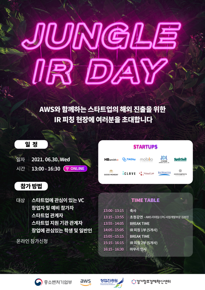 ‘정글 IR DAY’는 6월 30일 경기도 판교 경기창조경제혁신센터 국제회의장에서 오후 1시부터 진행되며, 온라인으로도 동시 참여 가능하다. 사전 참가신청은 홈페이지를 통해 신청할 수 있다.